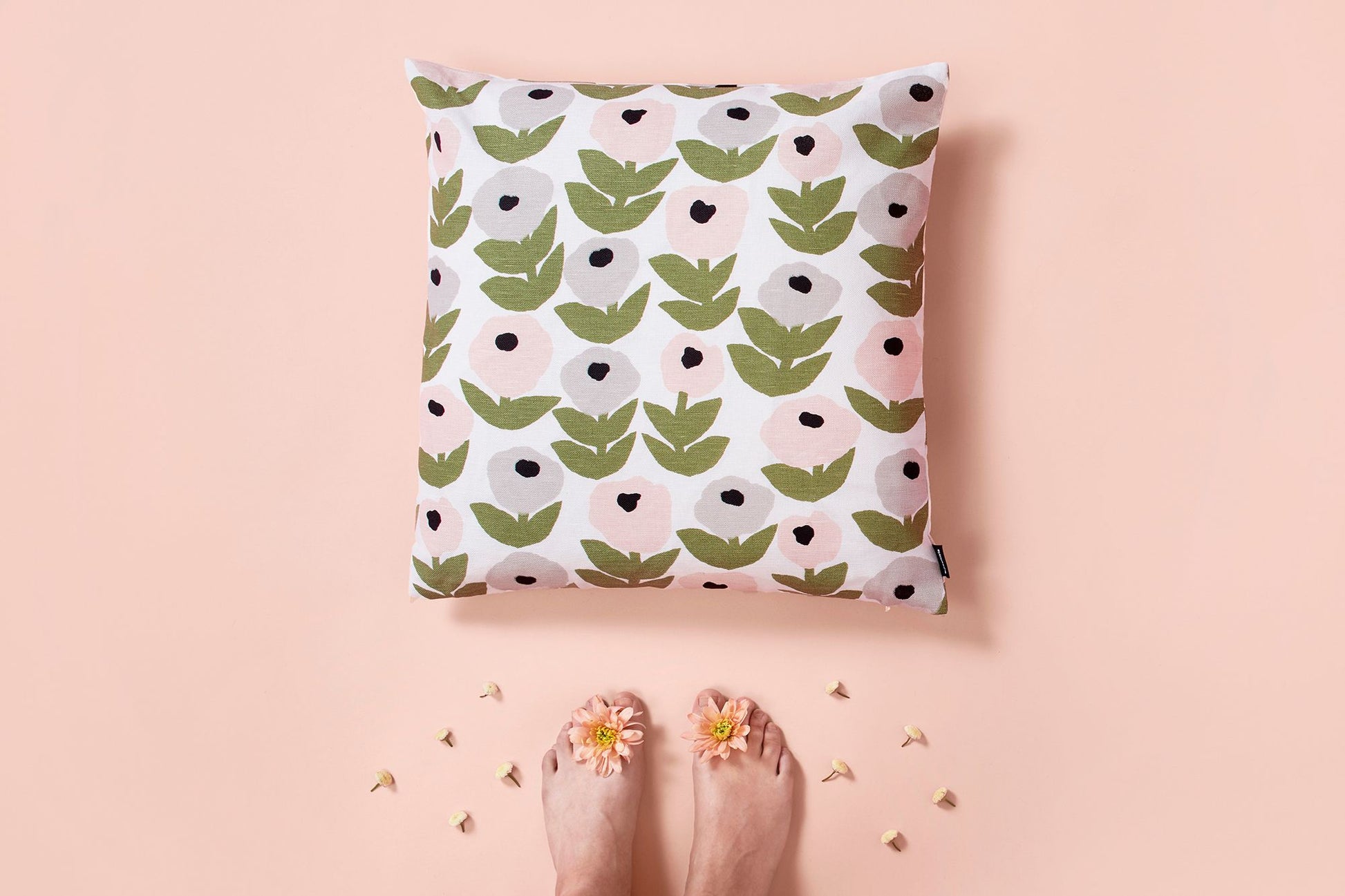 Das Kissen Flora ist mit einer Wiese verziert, auf der sich rosa und hellblaue Blumen mit zartem Grün mischen.
