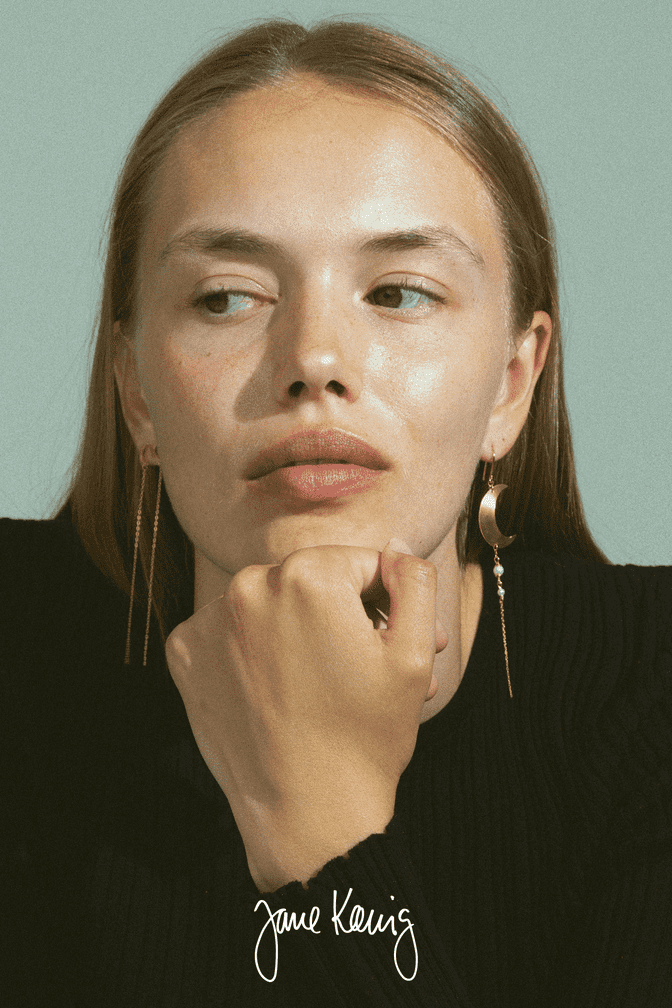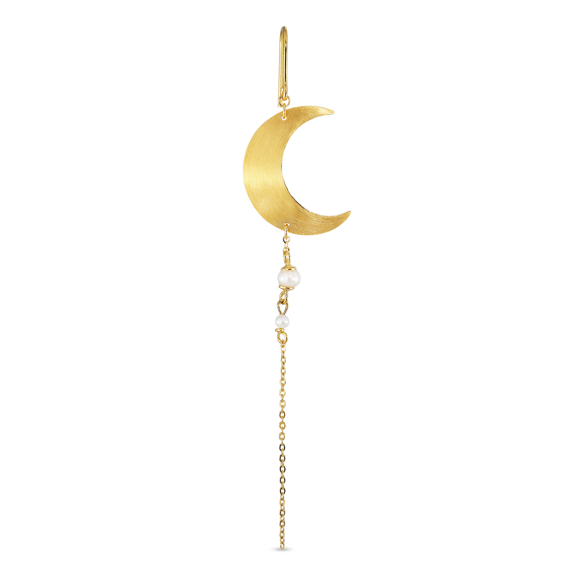 Der Half Moon Ohrring mit Perlenkette der dänischen Designerin Jane Kønig ist eine Kombination aus modernem Design und zarter Eleganz. Der Kontrast zwischen der Mondform und den an der Kette hängenden Perlen sorgt für einen markanten Hingucker. Dieser Ohrring ist die perfekte Wahl, wenn Sie Ihrem Outfit einen Hauch von Auffälligkeit und Persönlichkeit verleihen möchten. Tragen Sie es allein für einen eleganten Look oder kombinieren Sie es mit anderem Schmuck für einen mehrlagigen Stil. Die Länge des Schmucks beträgt. 8 cm. Der Ohrring ist aus vergoldetem Sterlingsilber gefertigt.