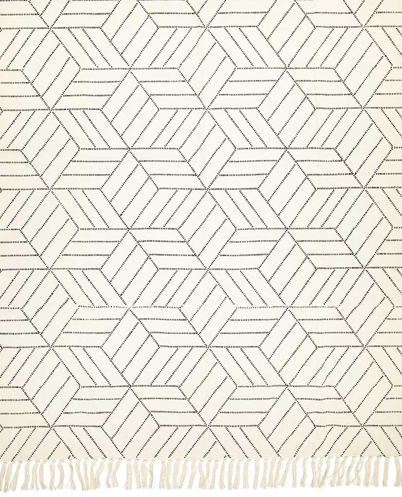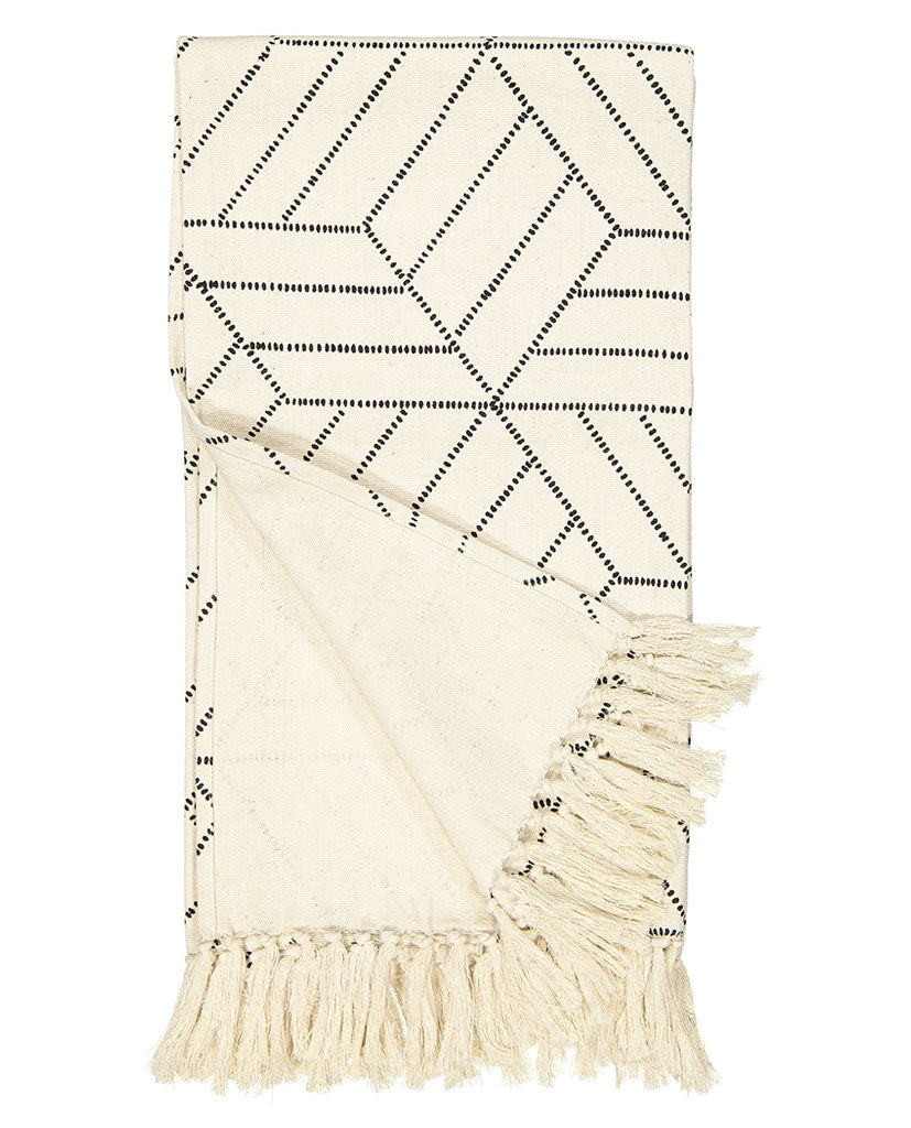 Die Kievari-Baumwolldecken und passenden Kissen von Finarten bestehen aus 100 % ungefärbter recycelter Baumwolle und das Muster wird im traditionellen Siebdruckverfahren von Hand auf den Textilstoff gedruckt.