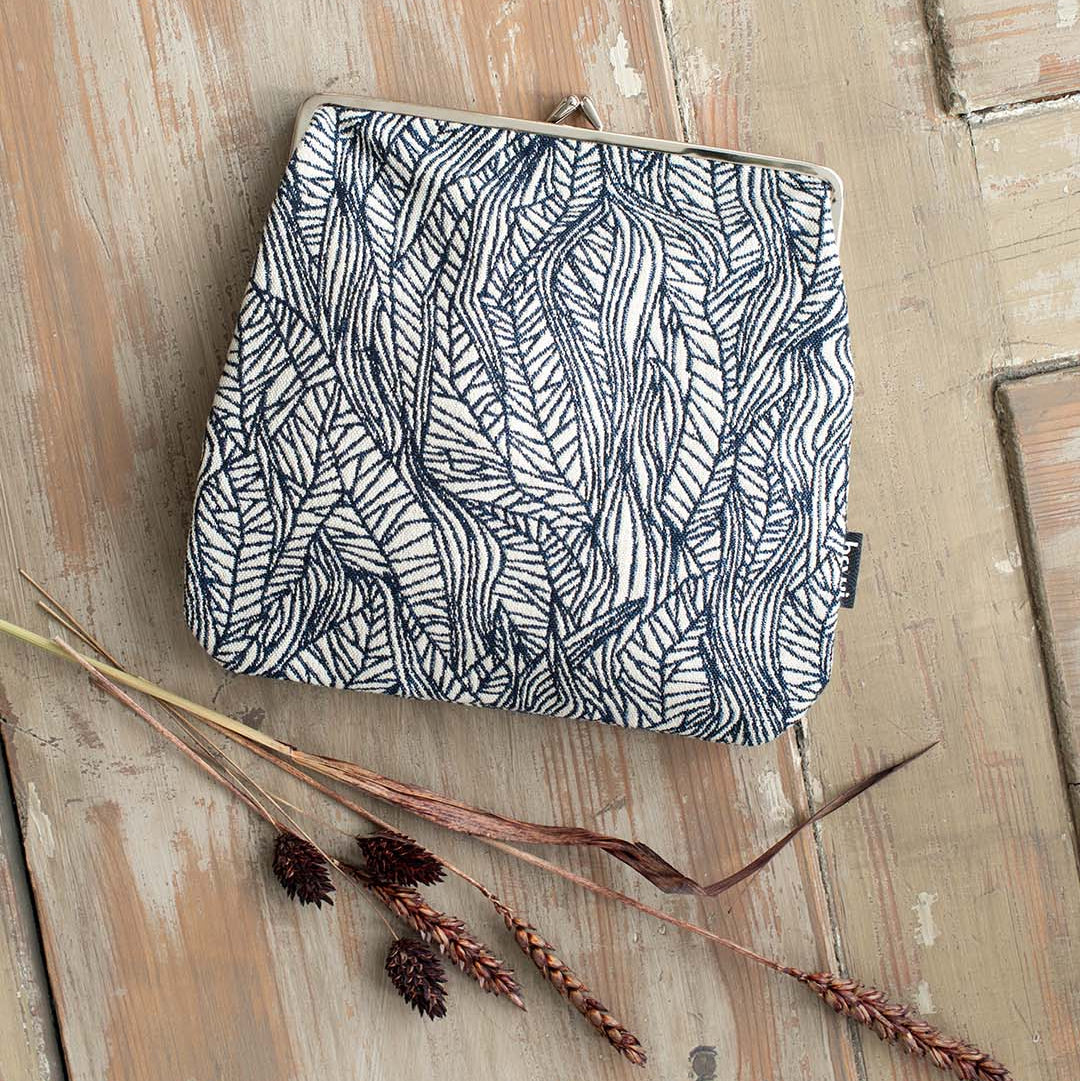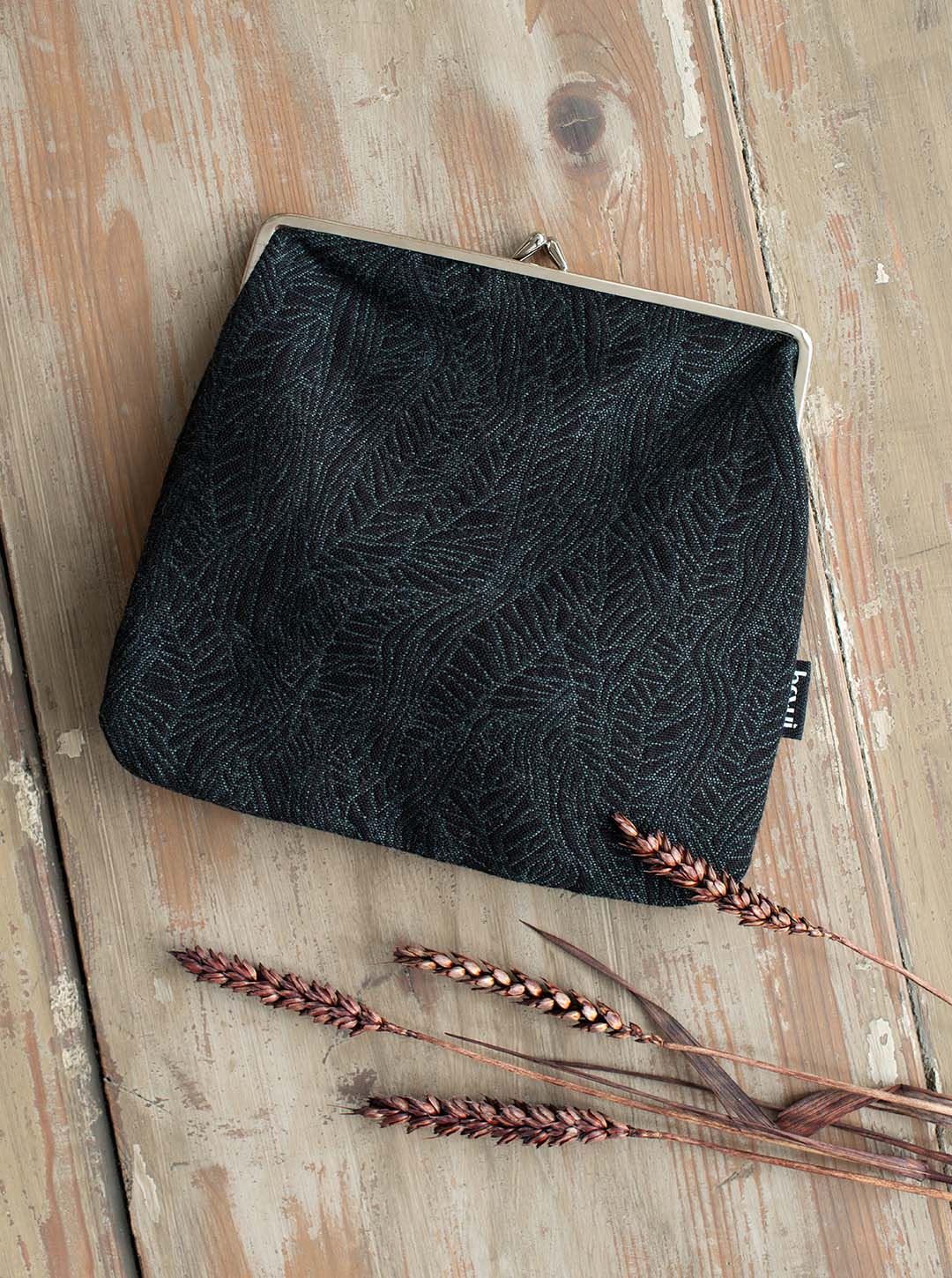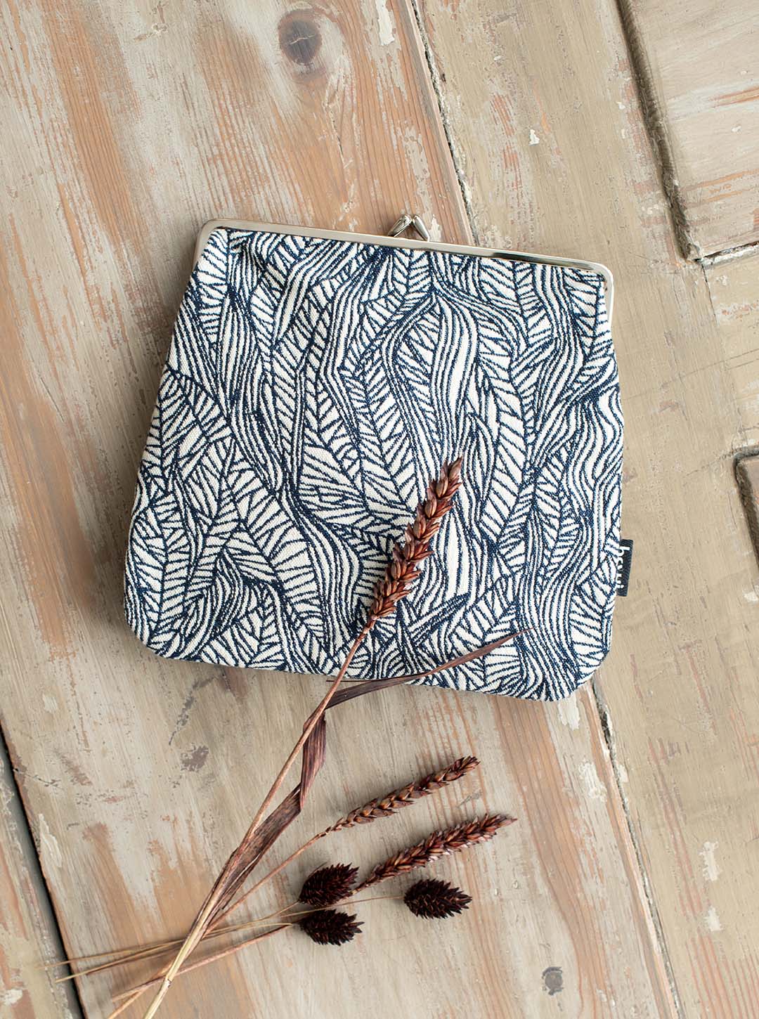 Die Korsikko-Rahmentasche besteht aus einem gemusterten, robusten Jacquardstoff mit Woll- und Baumwollanteil. Der Stoff wird in Lapua, Finnland, gewebt. Das grafische korsische Muster ist von der salzigen Meeresbrise und wild geschwungenem Schilf inspiriert. Das Muster wurde von Saija Helin entworfen.