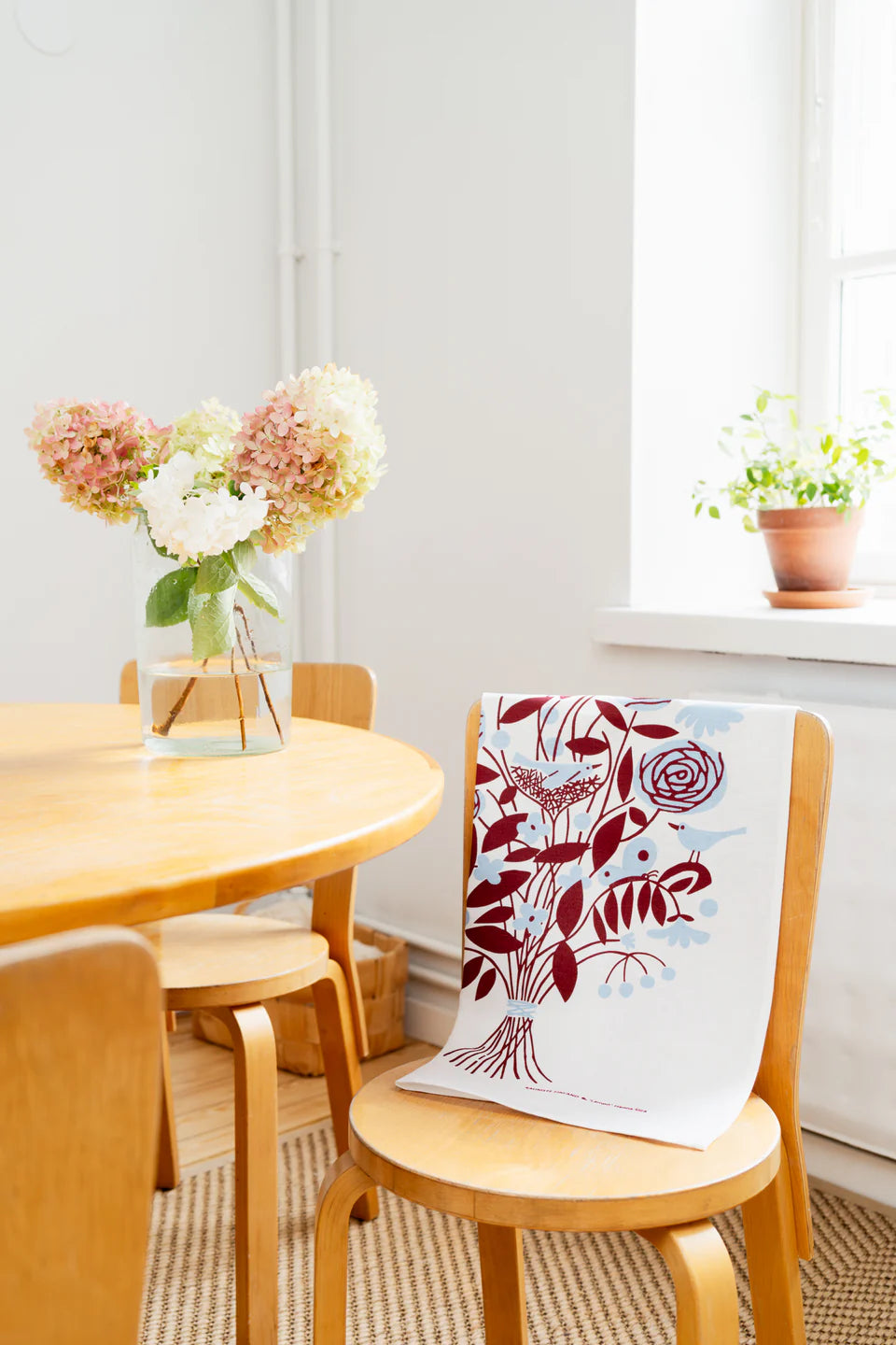 Das Lämpö Küchentuch bringt sommerliche Atmosphäre und warme Gedanken in Ihre Küche. Das üppige Bouquet, entworfen von Hanna Siira, vereint Blumen, Vögel und Bienen auf charmante Weise. Tiefes Burgunderrot und helles Hellblau bilden ein markantes und harmonisches Farbschema für das Handtuch.