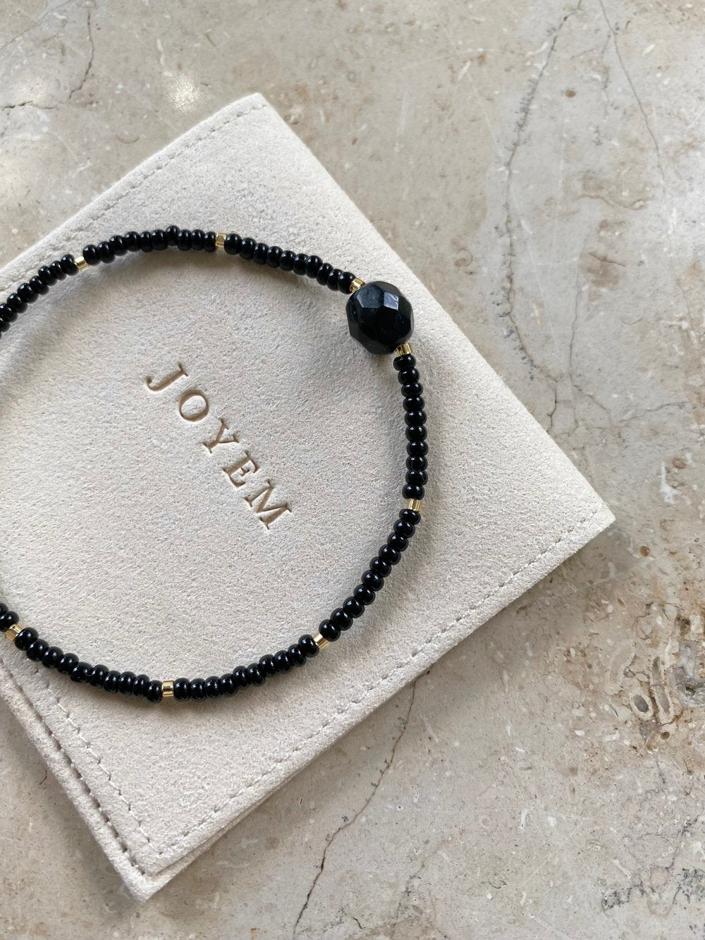 -Material: einzigartiger schwarzer Vintage-Stein, hochwertige japanische schwarze Glasperlen und ein Hauch von Gold