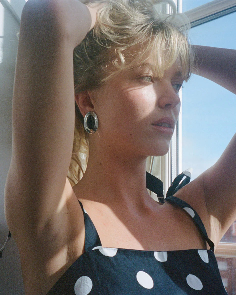 Dieser auffällige Ohrring, der in Zusammenarbeit zwischen Katarina Krebs und Jane Kønig entstanden ist, kombiniert altmodischen Glamour mit modernem Design. Das Schmuckstück bezaubert durch seinen großen ovalen Ring, in dessen Mitte sich ein funkelnder schwarzer Glasstein befindet. Die organische Oberfläche des Stücks ist von Jane Kønigs ikonischem Bruised Heart Hoop- Ohrring inspiriert und verleiht dem Look einen Hauch rauer Eleganz.
