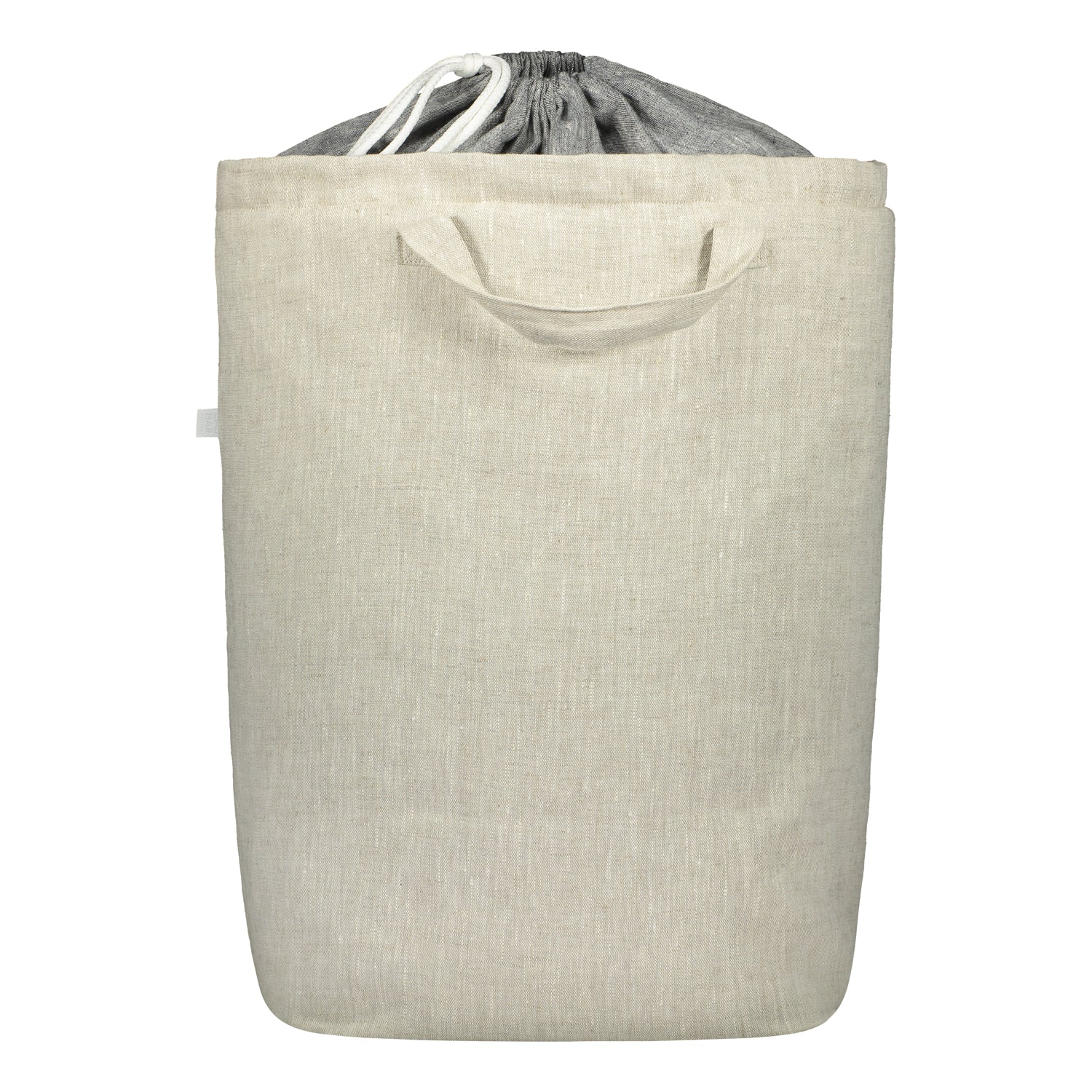 Wäschekorb Höhe ca. 60 cm und Durchmesser ca. 35 cm. Der Oberstoff besteht zu 100 % aus Leinen, das Futter aus 100 % schmutzabweisendem Polyestergewebe. Zwischen dem Leinenstoff und dem Futter befindet sich ein Kunststoffnetz, das den Korb aufrecht hält. Durch Öffnen des Klettverschlusses lässt sich das Netz einfach abnehmen.