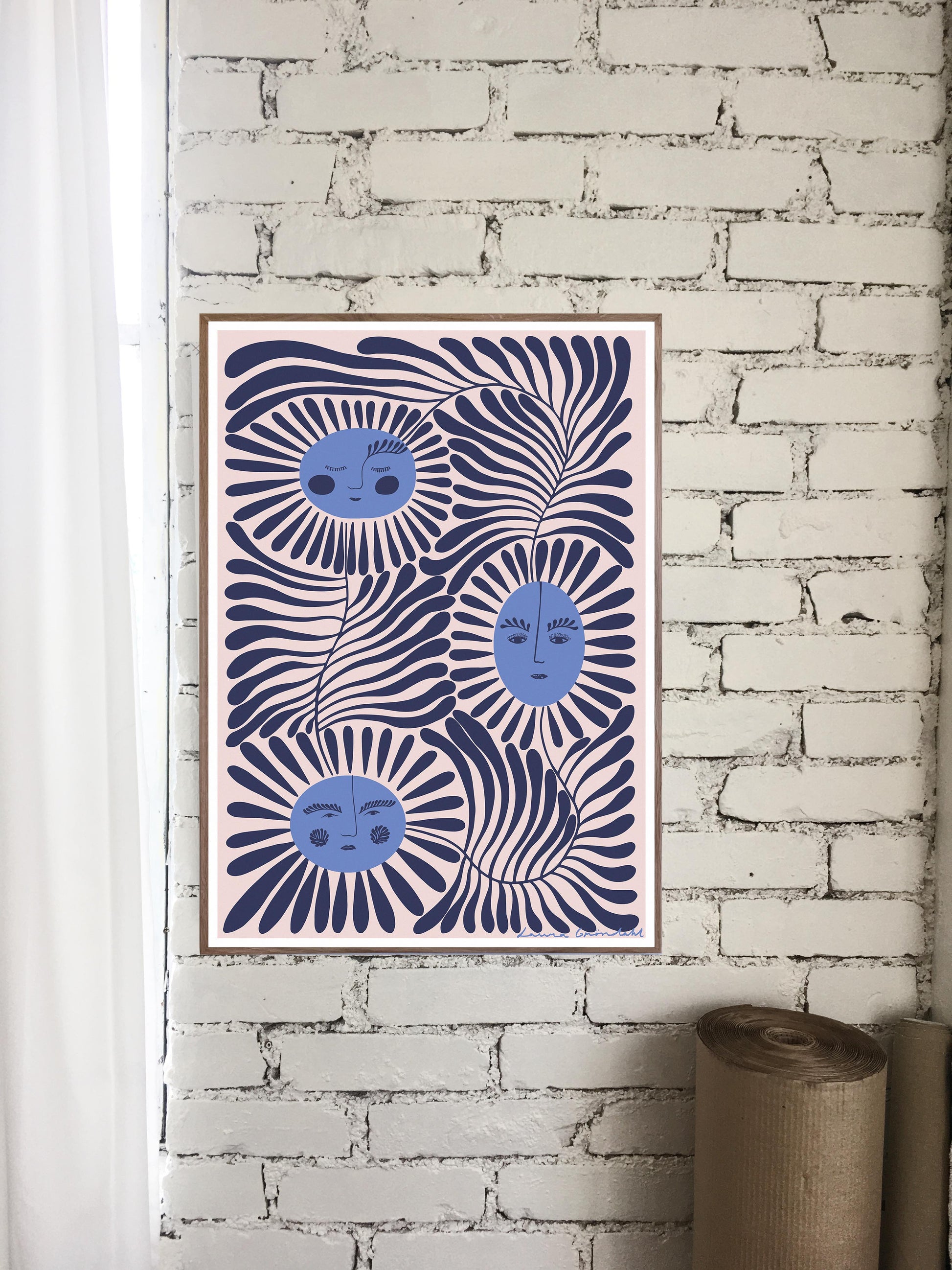 Das Kunstposter „We Are Here For You Blue“ von Laura Gröndahl zieht die Blicke auf sich und verleiht jedem Raum eine markante Note.