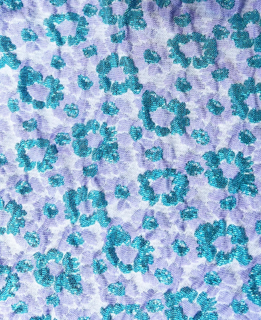 The Forget Me Not flower (Finnish: Pet ) symbolizes love and respect. When you give someone these sweet little flowers, it's a promise that you'll always remember them and keep them in your thoughts. R/H's Metallic Shiny Small Pets are also a promise of parties, memorable moments with important people. The high-quality Forget Me Not fabric woven in France is a festive lavender and sky blue Jacquard fabric that turns heads at Takuu.