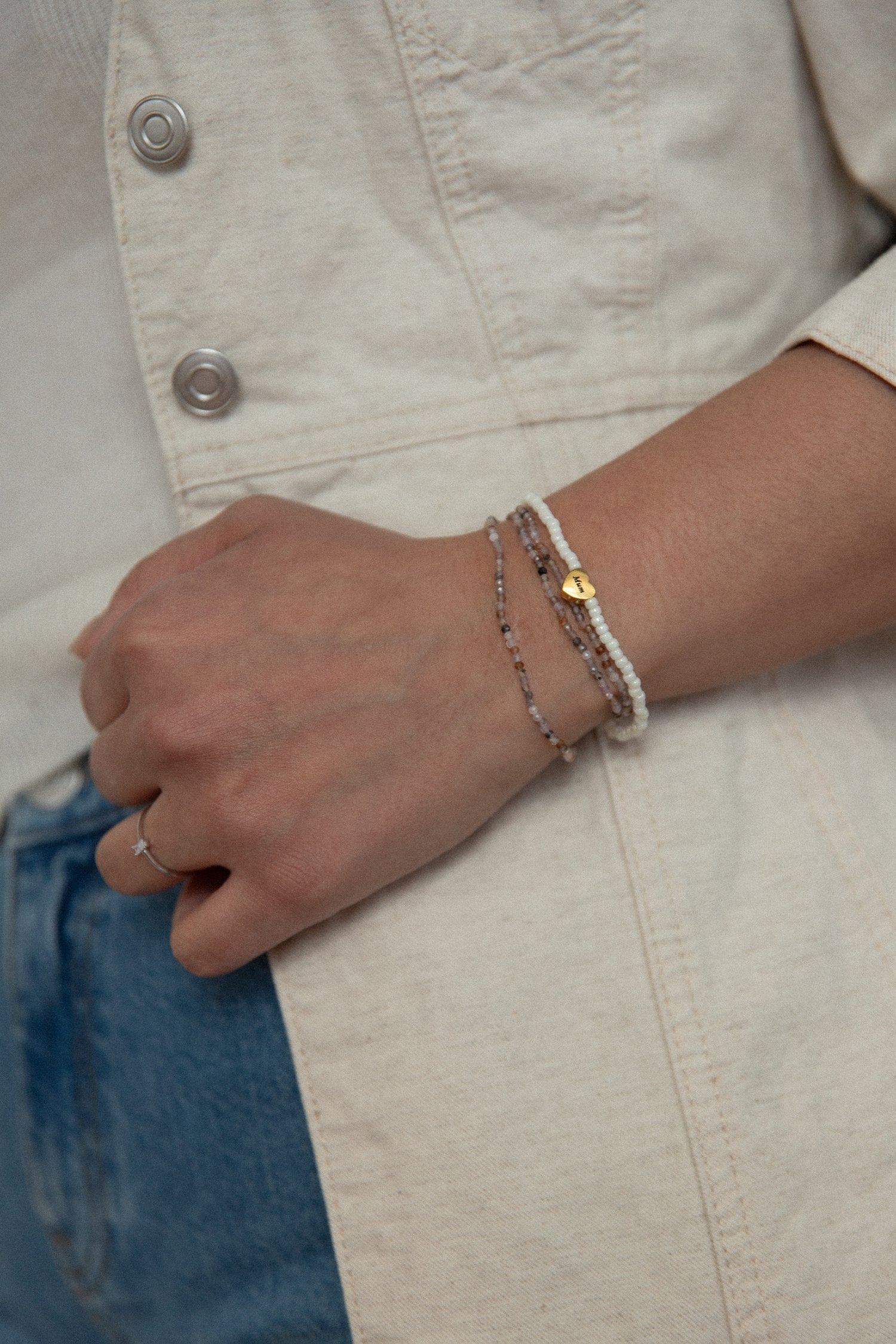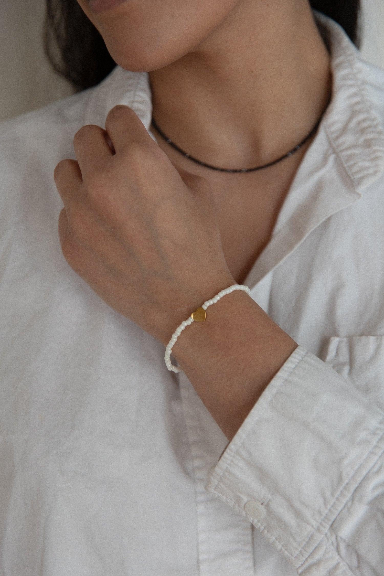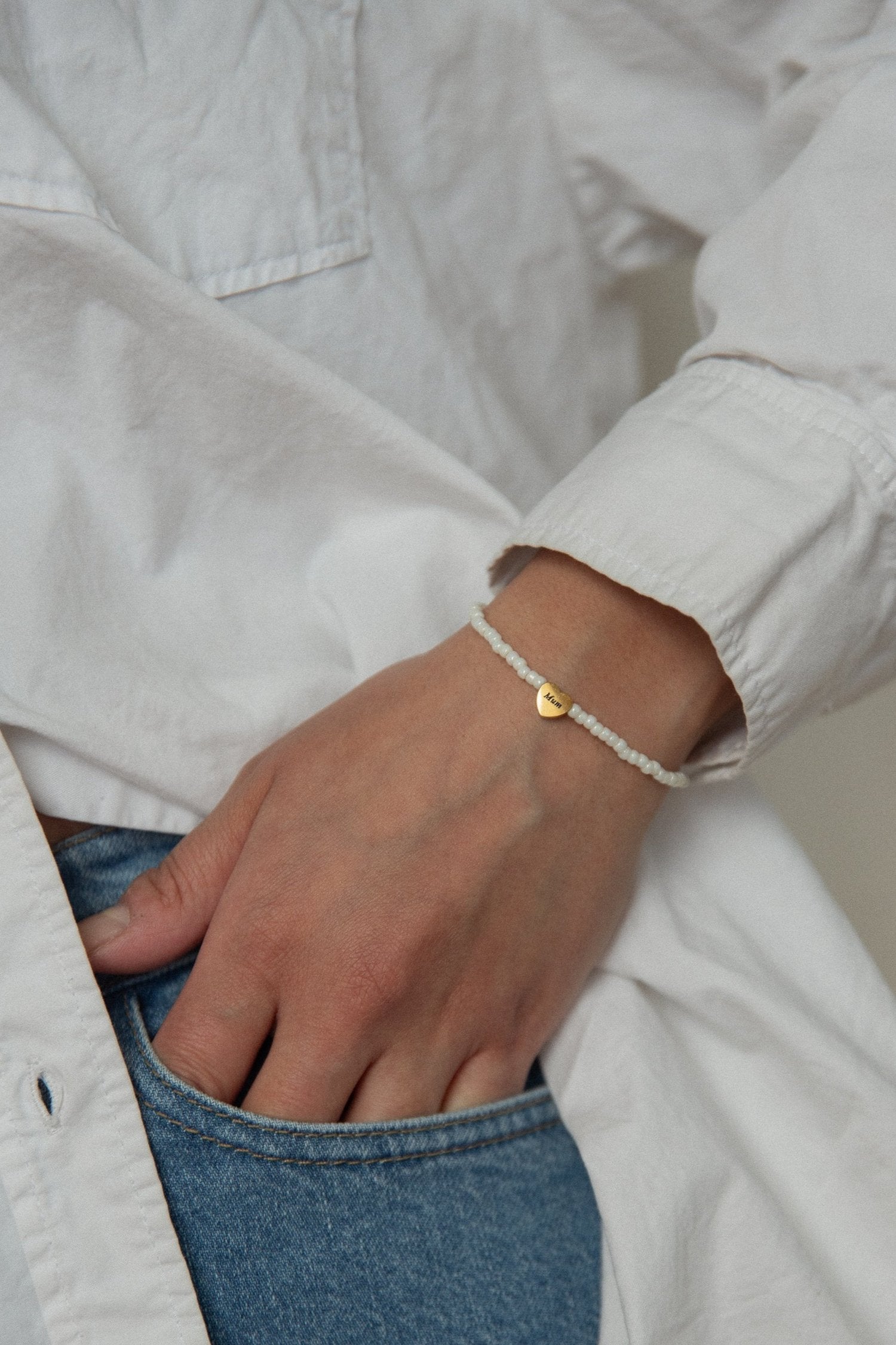 Koristeellinen helmirannekoru on valmistettu hohtavista japanilaisista lasihelmistä ja viimeistelty kauniilla, kaiverretulla sydänriipuksella kultaisena. Koru sopii erinomaisesti yhdistettäväksi muihin JOYEM-rannekoruihin tai rakkaisiin koruihisi.